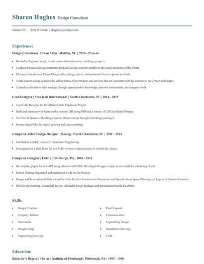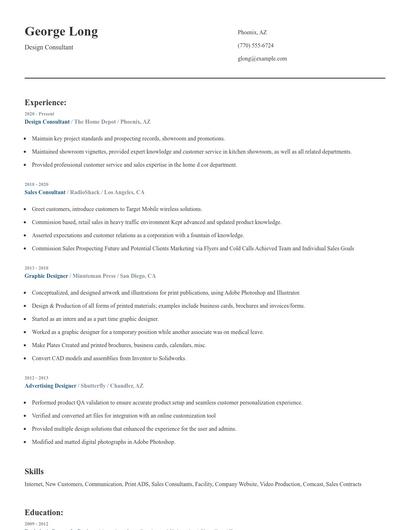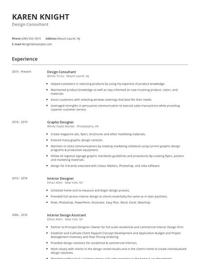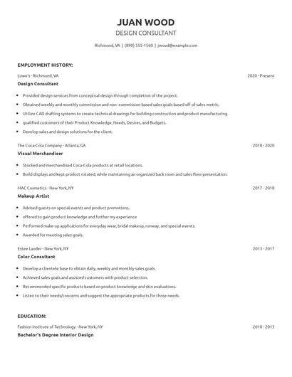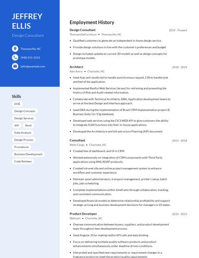 You can use Zippia's AI resume builder to make the resume writing process easier while also making sure that you include key information that hiring managers expect to see on a design consultant resume. You'll find resume tips and examples of skills, responsibilities, and summaries, all provided by Zippi, your career sidekick.