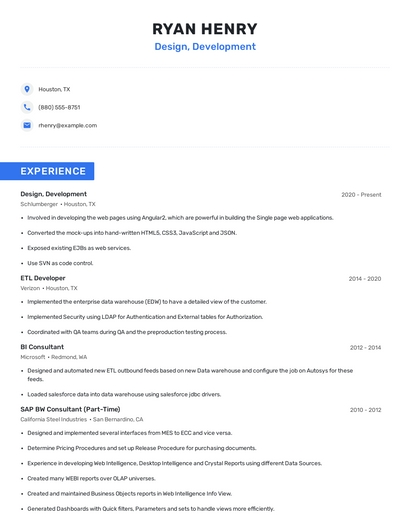 Build a professional design, development resume in minutes. Browse through our resume examples to identify the best way to word your resume. Then choose from 5+ resume templates to create your design, development resume.