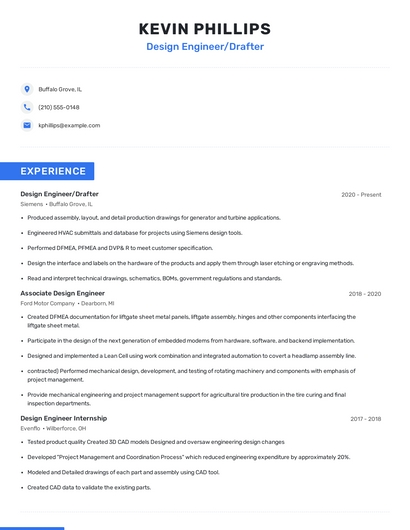 Build a professional design engineer/drafter resume in minutes. Browse through our resume examples to identify the best way to word your resume. Then choose from 5+ resume templates to create your design engineer/drafter resume.