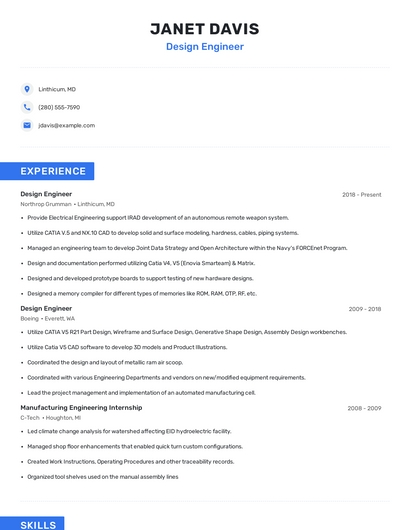 Build a professional design engineer resume in minutes. Browse through our resume examples to identify the best way to word your resume. Then choose from 5+ resume templates to create your design engineer resume.