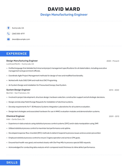 Build a professional design manufacturing engineer resume in minutes. Browse through our resume examples to identify the best way to word your resume. Then choose from 5+ resume templates to create your design manufacturing engineer resume.