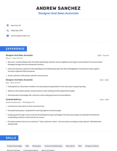Build a professional designer and sales associate resume in minutes. Browse through our resume examples to identify the best way to word your resume. Then choose from 5+ resume templates to create your designer and sales associate resume.