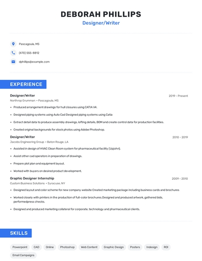 Build a professional designer/writer resume in minutes. Browse through our resume examples to identify the best way to word your resume. Then choose from 5+ resume templates to create your designer/writer resume.
