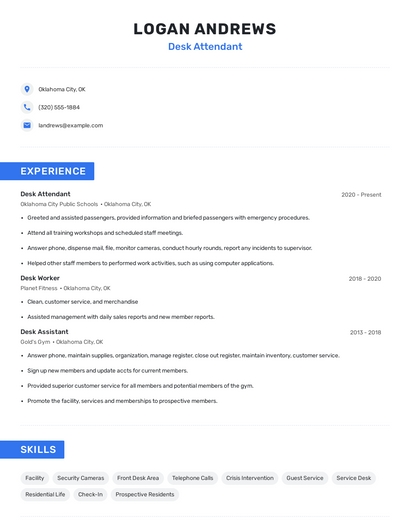 Build a professional desk attendant resume in minutes. Browse through our resume examples to identify the best way to word your resume. Then choose from 5+ resume templates to create your desk attendant resume.
