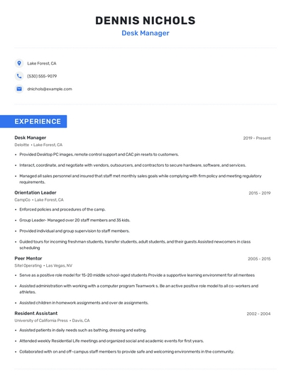 Build a professional desk manager resume in minutes. Browse through our resume examples to identify the best way to word your resume. Then choose from 5+ resume templates to create your desk manager resume.