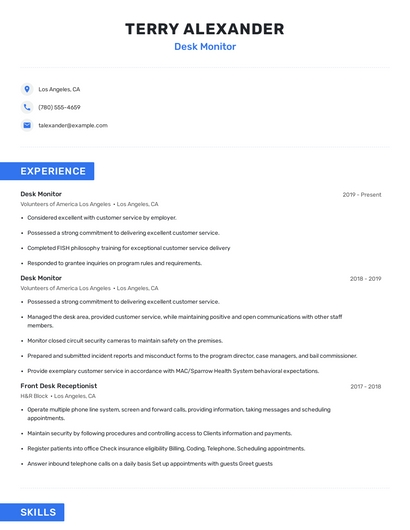 The most important skills for a desk monitor resume and required skills for a desk monitor to have include: