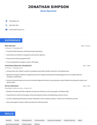 Build a professional desk operator resume in minutes. Browse through our resume examples to identify the best way to word your resume. Then choose from 5+ resume templates to create your desk operator resume.