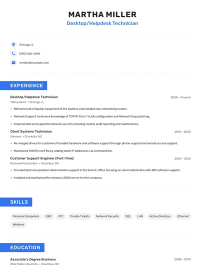Build a professional desktop/helpdesk technician resume in minutes. Browse through our resume examples to identify the best way to word your resume. Then choose from 5+ resume templates to create your desktop/helpdesk technician resume.