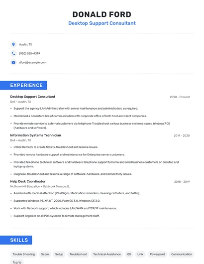 Build a professional desktop support consultant resume in minutes. Browse through our resume examples to identify the best way to word your resume. Then choose from 5+ resume templates to create your desktop support consultant resume.