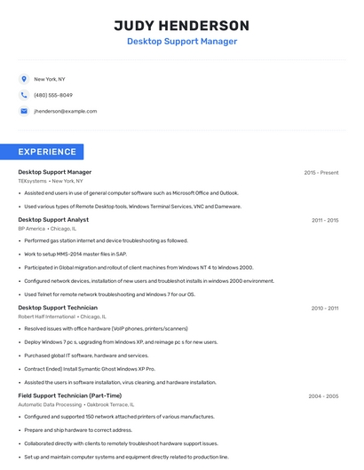 Build a professional desktop support manager resume in minutes. Browse through our resume examples to identify the best way to word your resume. Then choose from 5+ resume templates to create your desktop support manager resume.