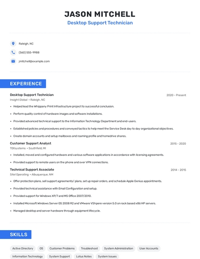 Build a professional desktop support technician resume in minutes. Browse through our resume examples to identify the best way to word your resume. Then choose from 5+ resume templates to create your desktop support technician resume.