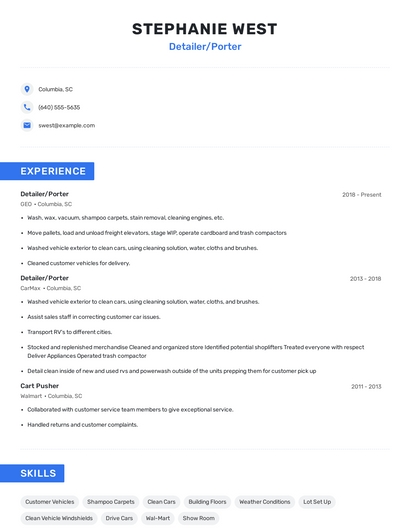 Build a professional detailer/porter resume in minutes. Browse through our resume examples to identify the best way to word your resume. Then choose from 5+ resume templates to create your detailer/porter resume.