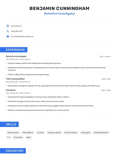Build a professional detective investigator resume in minutes. Browse through our resume examples to identify the best way to word your resume. Then choose from 5+ resume templates to create your detective investigator resume.