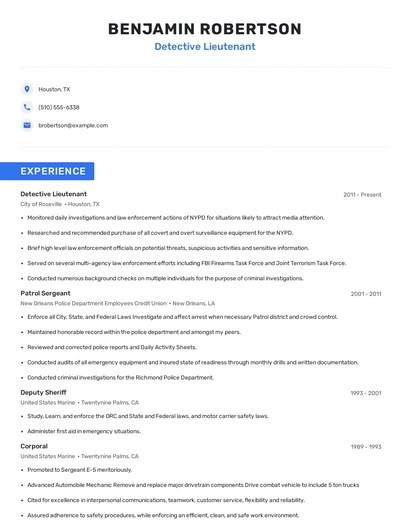 Build a professional detective lieutenant resume in minutes. Browse through our resume examples to identify the best way to word your resume. Then choose from 5+ resume templates to create your detective lieutenant resume.