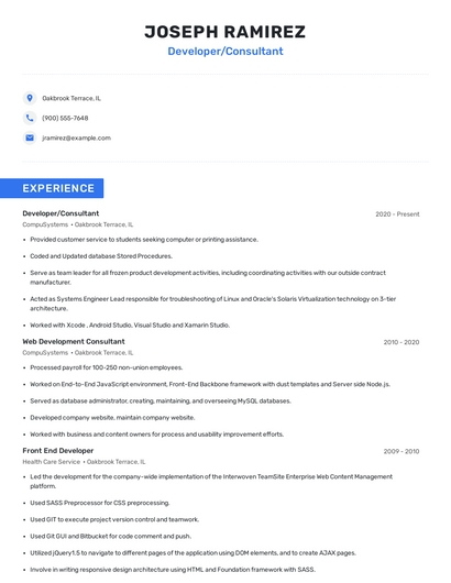 Build a professional developer/consultant resume in minutes. Browse through our resume examples to identify the best way to word your resume. Then choose from 5+ resume templates to create your developer/consultant resume.