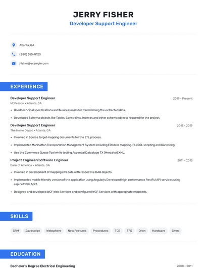 Build a professional developer support engineer resume in minutes. Browse through our resume examples to identify the best way to word your resume. Then choose from 5+ resume templates to create your developer support engineer resume.