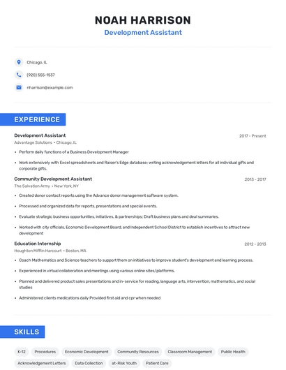 Build a professional development assistant resume in minutes. Browse through our resume examples to identify the best way to word your resume. Then choose from 5+ resume templates to create your development assistant resume.