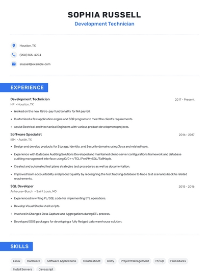 Build a professional development technician resume in minutes. Browse through our resume examples to identify the best way to word your resume. Then choose from 5+ resume templates to create your development technician resume.