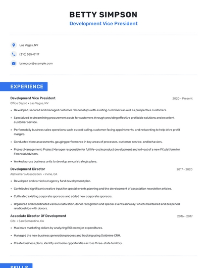 Build a professional development vice president resume in minutes. Browse through our resume examples to identify the best way to word your resume. Then choose from 5+ resume templates to create your development vice president resume.