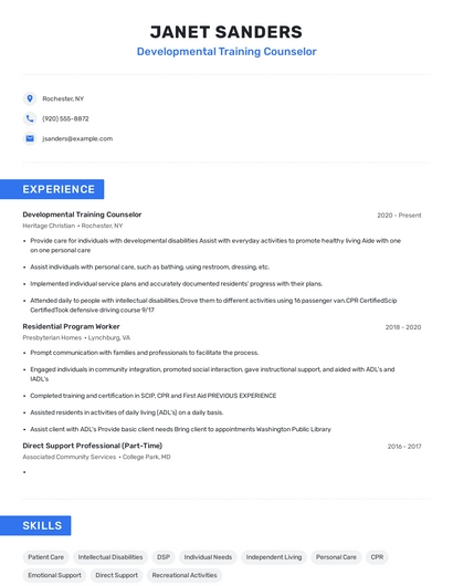 Build a professional developmental training counselor resume in minutes. Browse through our resume examples to identify the best way to word your resume. Then choose from 5+ resume templates to create your developmental training counselor resume.