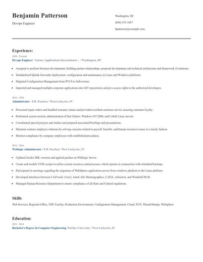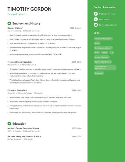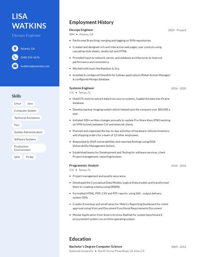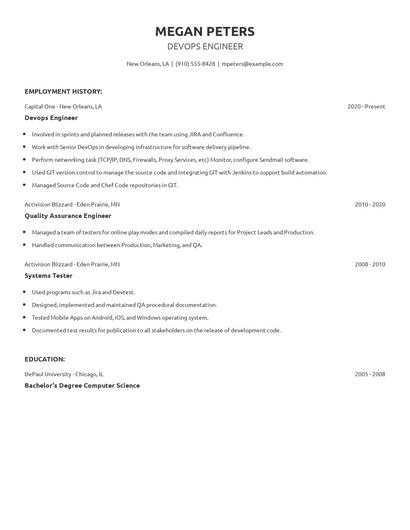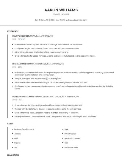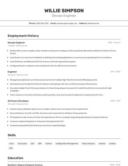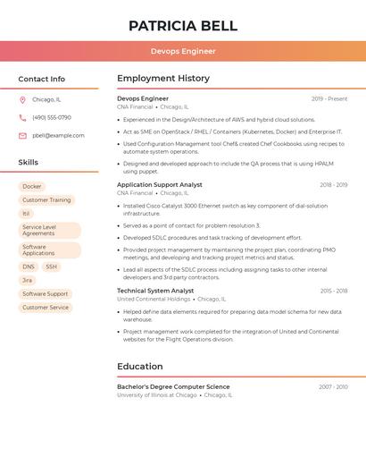 Here are example skills to include in your “Area of Expertise” on a devops engineer resume: