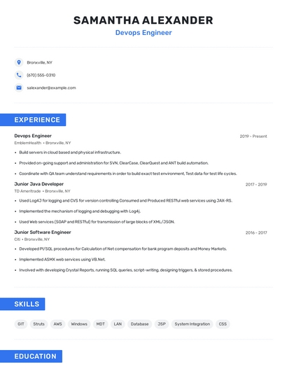 Build a professional devops engineer resume in minutes. Browse through our resume examples to identify the best way to word your resume. Then choose from 5+ resume templates to create your devops engineer resume.