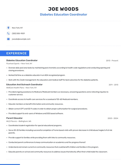 Build a professional diabetes education coordinator resume in minutes. Browse through our resume examples to identify the best way to word your resume. Then choose from 5+ resume templates to create your diabetes education coordinator resume.