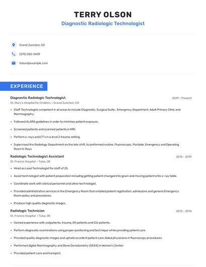 Build a professional diagnostic radiologic technologist resume in minutes. Browse through our resume examples to identify the best way to word your resume. Then choose from 5+ resume templates to create your diagnostic radiologic technologist resume.