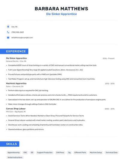 Build a professional die sinker apprentice resume in minutes. Browse through our resume examples to identify the best way to word your resume. Then choose from 5+ resume templates to create your die sinker apprentice resume.
