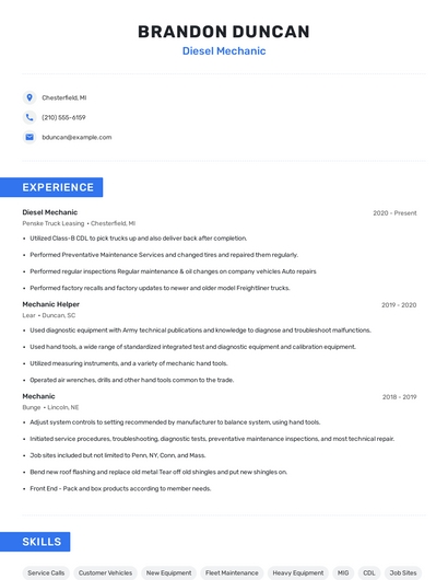 Build a professional diesel mechanic resume in minutes. Browse through our resume examples to identify the best way to word your resume. Then choose from 5+ resume templates to create your diesel mechanic resume.