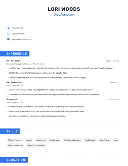 Build a professional diet assistant resume in minutes. Browse through our resume examples to identify the best way to word your resume. Then choose from 5+ resume templates to create your diet assistant resume.