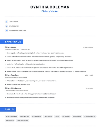 Build a professional dietary worker resume in minutes. Browse through our resume examples to identify the best way to word your resume. Then choose from 5+ resume templates to create your dietary worker resume.