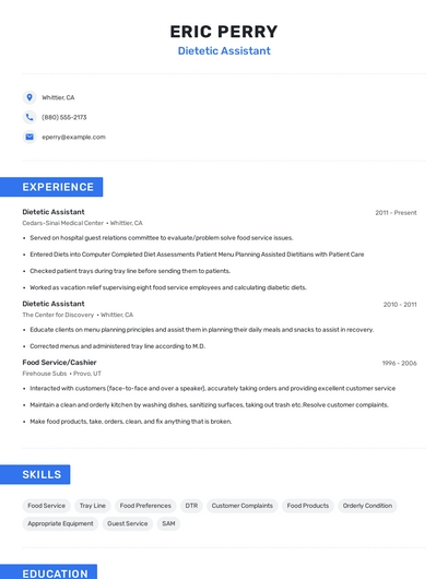 Build a professional dietetic assistant resume in minutes. Browse through our resume examples to identify the best way to word your resume. Then choose from 5+ resume templates to create your dietetic assistant resume.