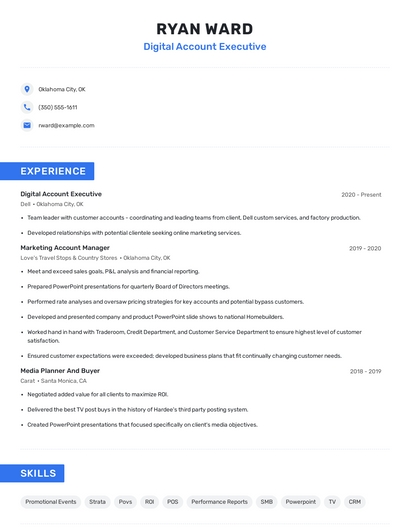 Build a professional digital account executive resume in minutes. Browse through our resume examples to identify the best way to word your resume. Then choose from 5+ resume templates to create your digital account executive resume.