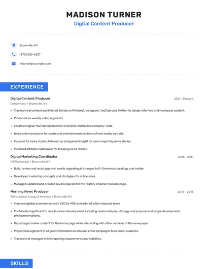Build a professional digital content producer resume in minutes. Browse through our resume examples to identify the best way to word your resume. Then choose from 5+ resume templates to create your digital content producer resume.