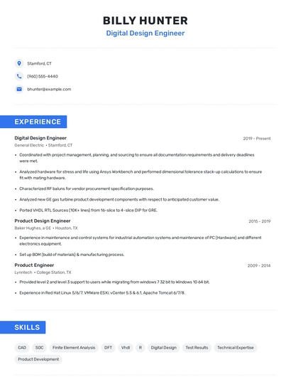 Build a professional digital design engineer resume in minutes. Browse through our resume examples to identify the best way to word your resume. Then choose from 5+ resume templates to create your digital design engineer resume.