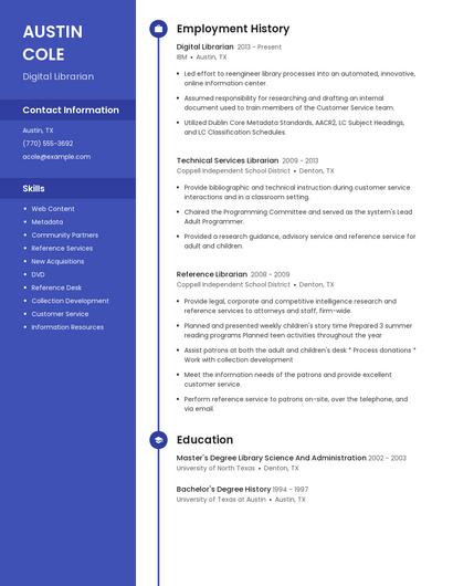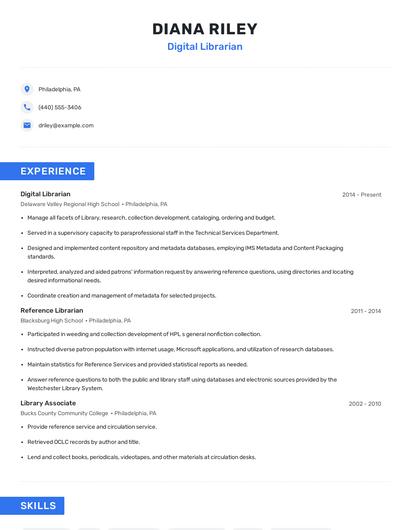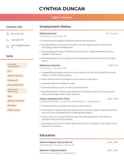 You can use Zippia's AI resume builder to make the resume writing process easier while also making sure that you include key information that hiring managers expect to see on a digital librarian resume. You'll find resume tips and examples of skills, responsibilities, and summaries, all provided by Zippi, your career sidekick.