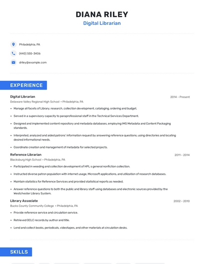 Build a professional digital librarian resume in minutes. Browse through our resume examples to identify the best way to word your resume. Then choose from 5+ resume templates to create your digital librarian resume.