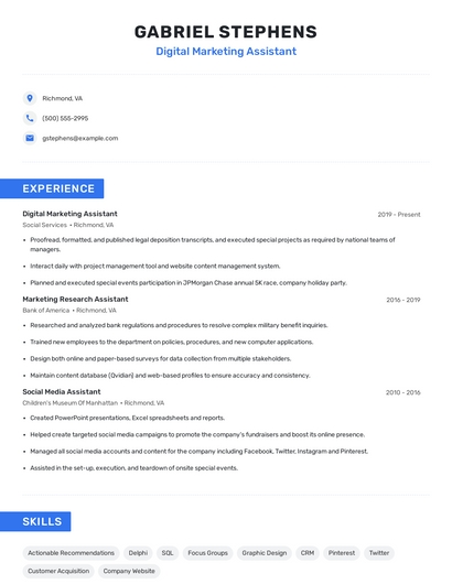 Build a professional digital marketing assistant resume in minutes. Browse through our resume examples to identify the best way to word your resume. Then choose from 5+ resume templates to create your digital marketing assistant resume.