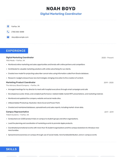 Build a professional digital marketing coordinator resume in minutes. Browse through our resume examples to identify the best way to word your resume. Then choose from 5+ resume templates to create your digital marketing coordinator resume.