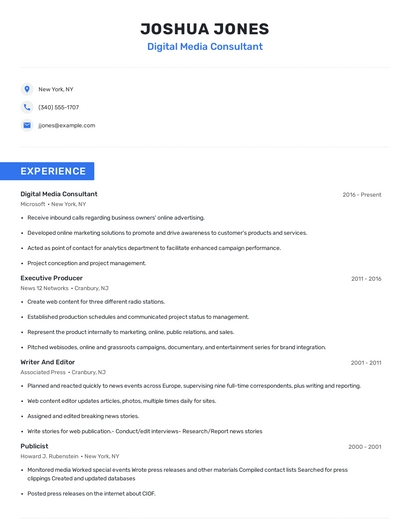 Build a professional digital media consultant resume in minutes. Browse through our resume examples to identify the best way to word your resume. Then choose from 5+ resume templates to create your digital media consultant resume.