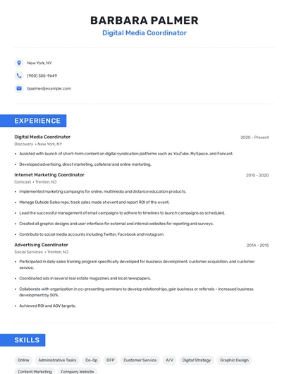 Build a professional digital media coordinator resume in minutes. Browse through our resume examples to identify the best way to word your resume. Then choose from 5+ resume templates to create your digital media coordinator resume.