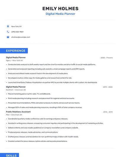 Build a professional digital media planner resume in minutes. Browse through our resume examples to identify the best way to word your resume. Then choose from 5+ resume templates to create your digital media planner resume.