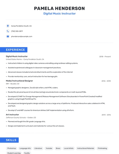 Build a professional digital music instructor resume in minutes. Browse through our resume examples to identify the best way to word your resume. Then choose from 5+ resume templates to create your digital music instructor resume.
