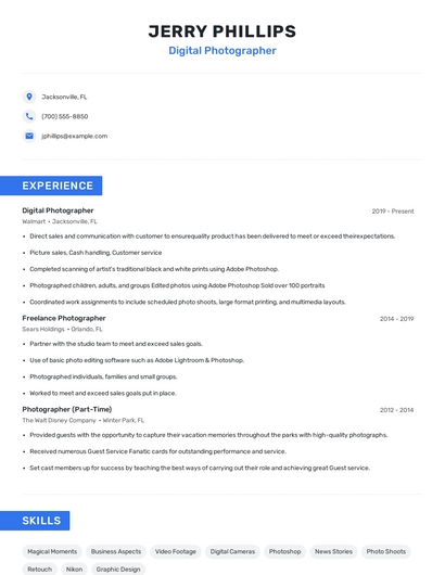 Build a professional digital photographer resume in minutes. Browse through our resume examples to identify the best way to word your resume. Then choose from 5+ resume templates to create your digital photographer resume.