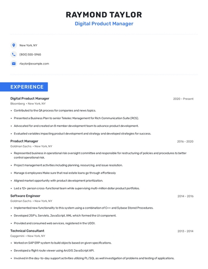 Build a professional digital product manager resume in minutes. Browse through our resume examples to identify the best way to word your resume. Then choose from 5+ resume templates to create your digital product manager resume.
