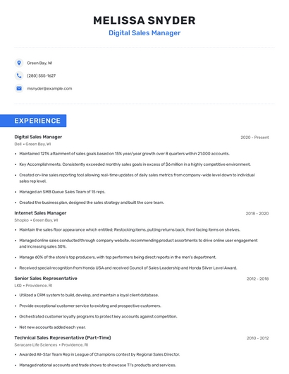 Build a professional digital sales manager resume in minutes. Browse through our resume examples to identify the best way to word your resume. Then choose from 5+ resume templates to create your digital sales manager resume.