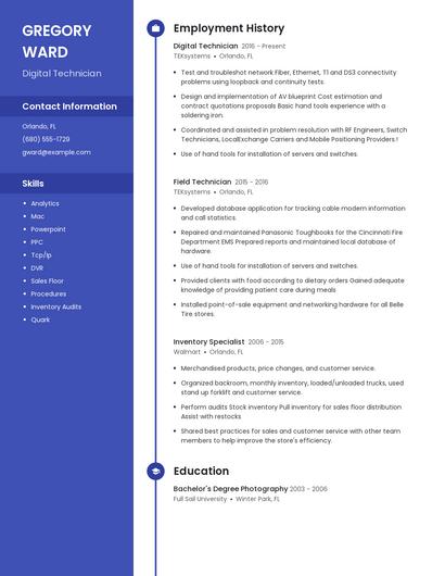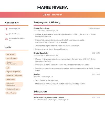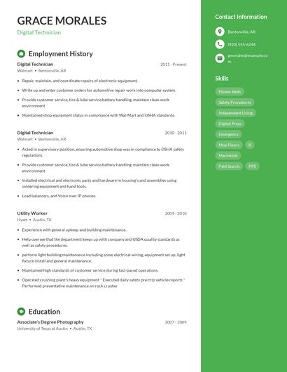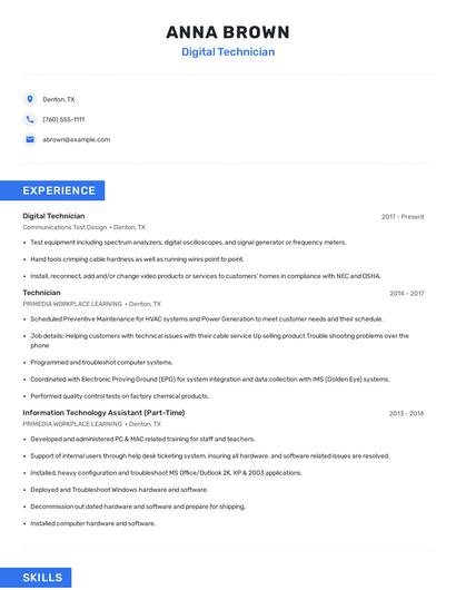 You can use Zippia's AI resume builder to make the resume writing process easier while also making sure that you include key information that hiring managers expect to see on a digital technician resume. You'll find resume tips and examples of skills, responsibilities, and summaries, all provided by Zippi, your career sidekick.