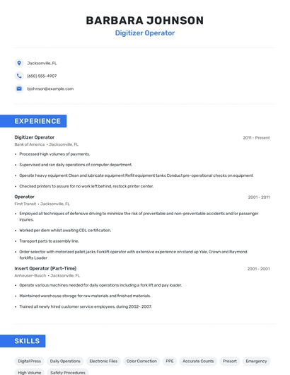 Build a professional digitizer operator resume in minutes. Browse through our resume examples to identify the best way to word your resume. Then choose from 5+ resume templates to create your digitizer operator resume.
