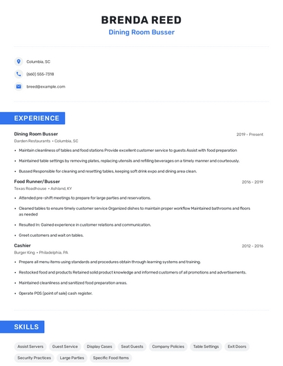 Choose from 10+ customizable dining room busser resume templates